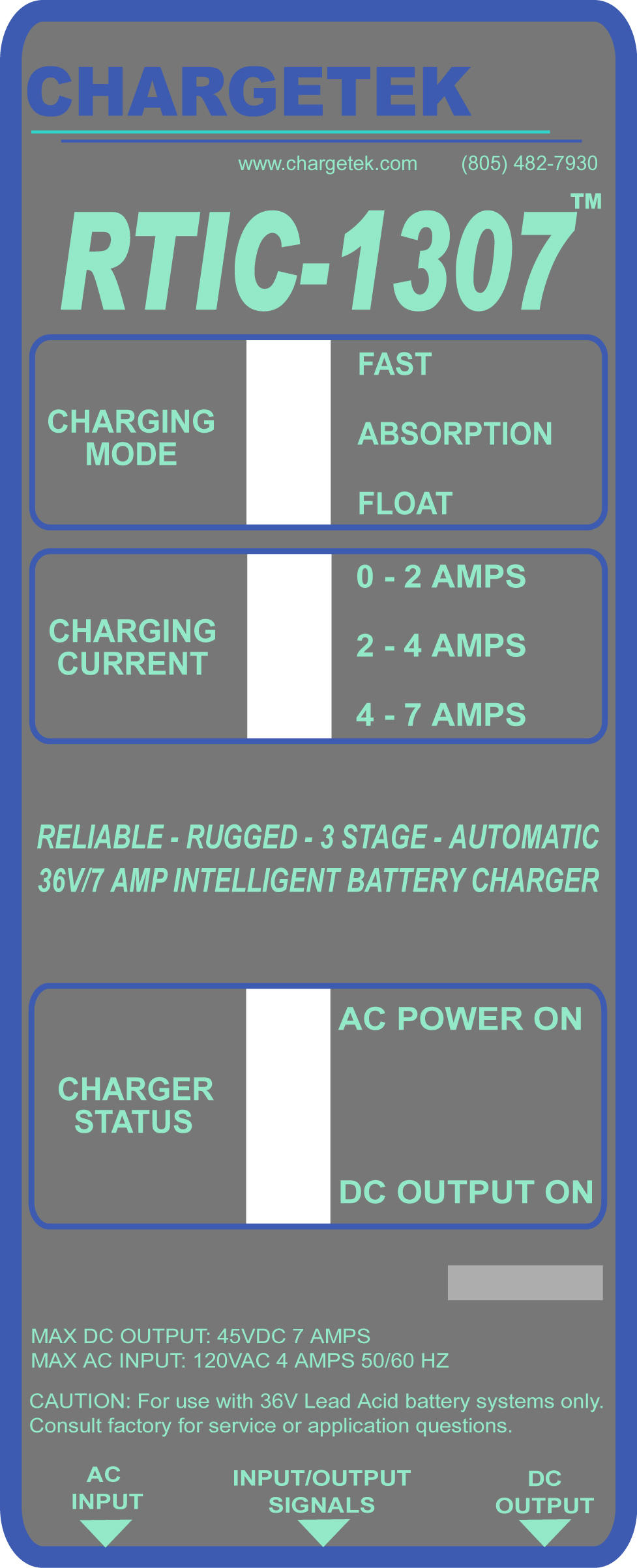 With a wide operating temperature range and UL/CSA1236 certification, the RTIC-WP product is especially suited for high end industrial applications and severe environments. This product series is versatile, rugged and waterproof. The RTIC-WP is factory programmable to accommodate several user defined charging algorithms. An LED display indicates charging and AC/DC status. There are also four optional user-defined signal/power relay contacts and long distance digital temperature compensation.