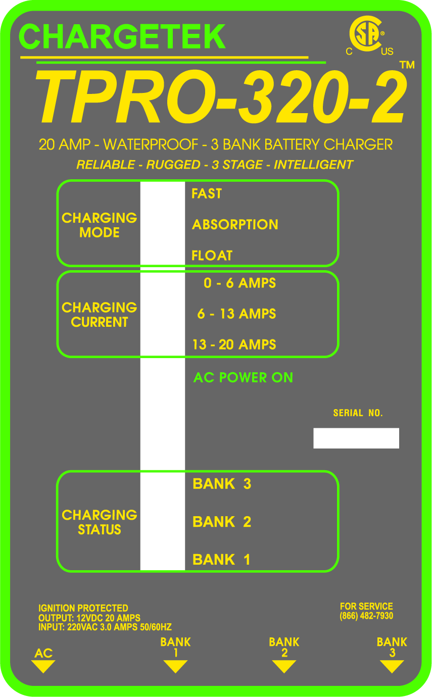 The TPRO multi-bank series is available in two and three bank configurations. Each bank is electrically isolated allowing for series and parallel configurations in 24V and 36V applications. Charge balancing of each bank is accomplished by sensing each bank independently and charging appropriately. With a wide operating temperature range and UL/CSA 1236 certification, this product is especially suited for high end industrial applications and severe environments. An LED display indicates charging and AC/DC status.